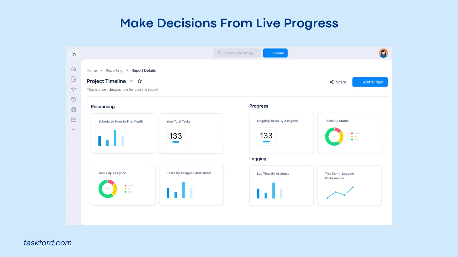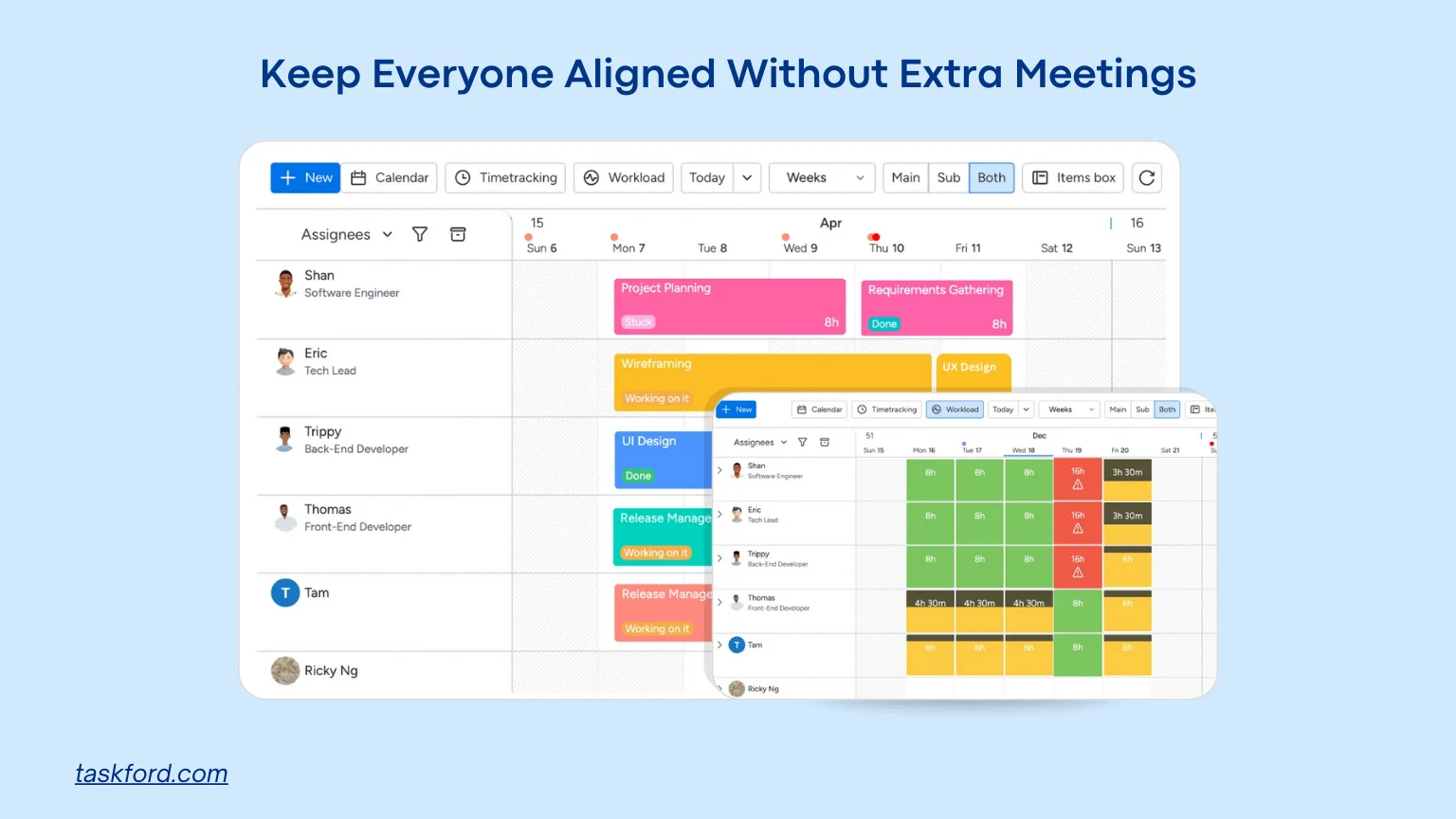 - Dashboards: Surface progress slowdowns, delivery pressure, and workload imbalance in one place.