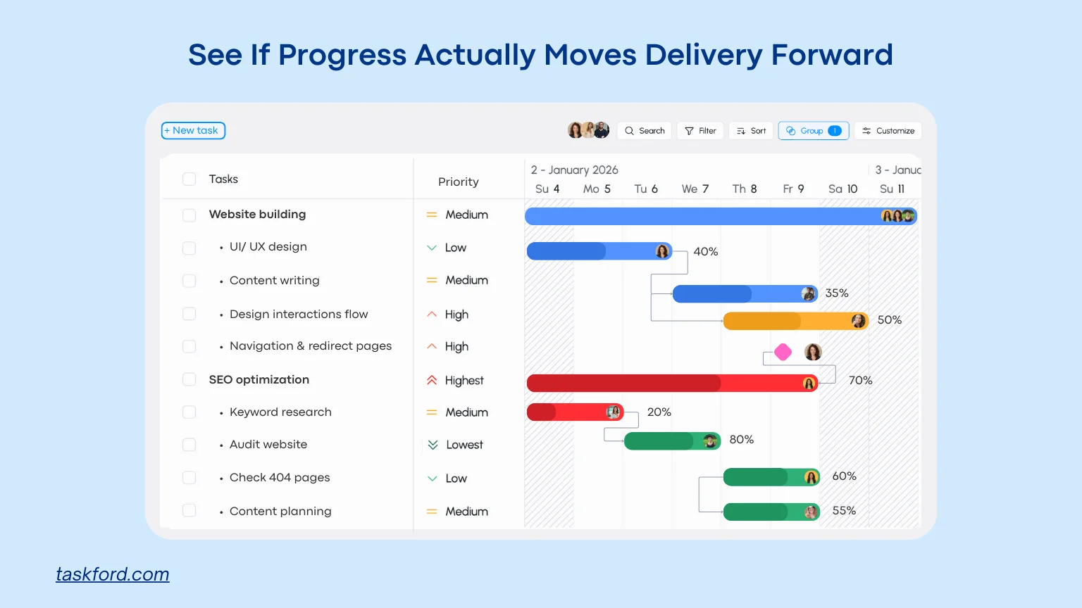 Most tools help teams organize work. TaskFord is built to expose whether that work is still safe to deliver. By keeping planning, execution, and visibility tightly connected, TaskFord reduces the gap between what teams see and what they feel. Confidence comes from shared execution reality, not from assumptions, status meetings, or delayed reports.