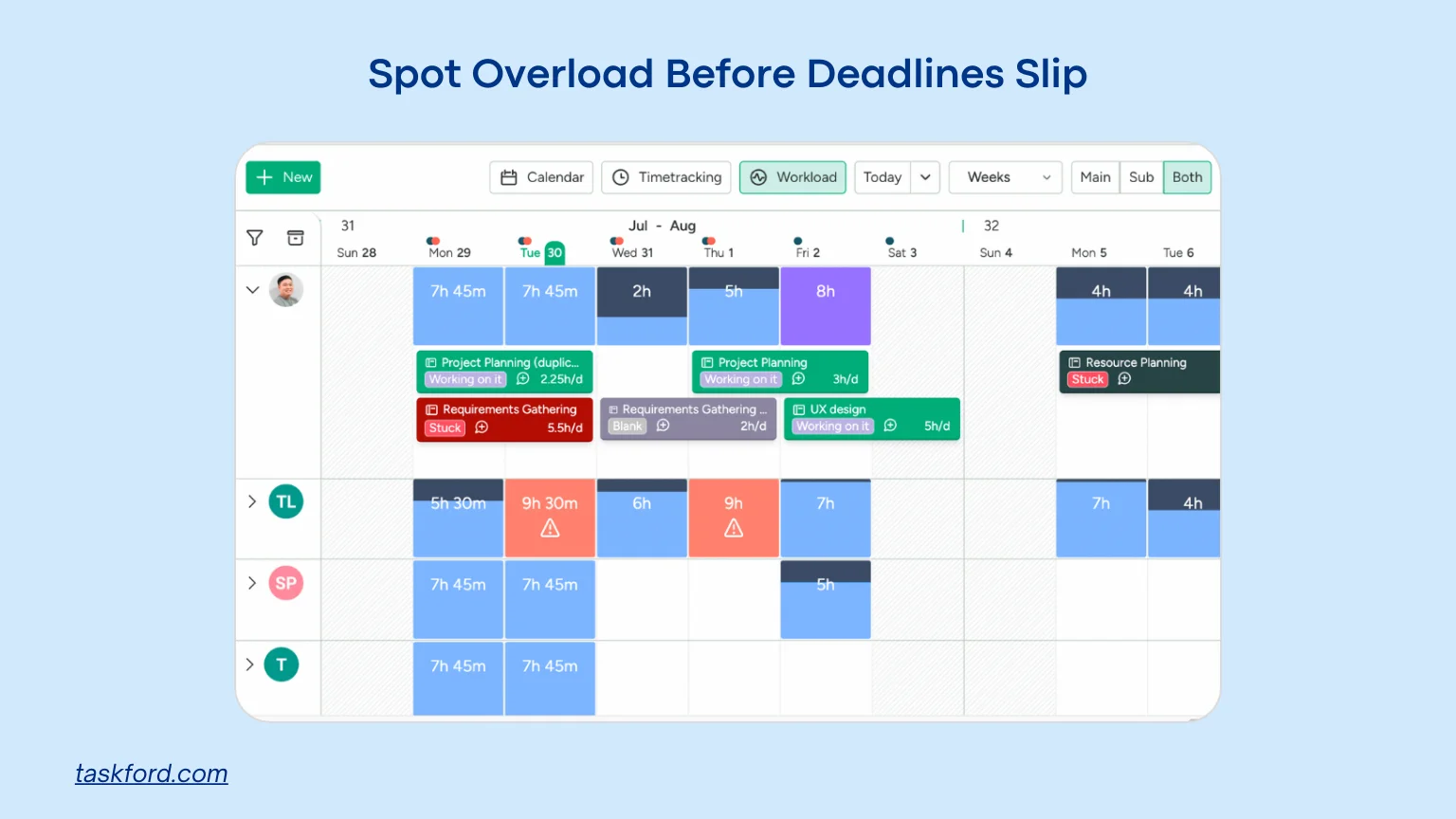 - Workload Views: Reveal when individuals or roles are carrying more work than delivery allows.