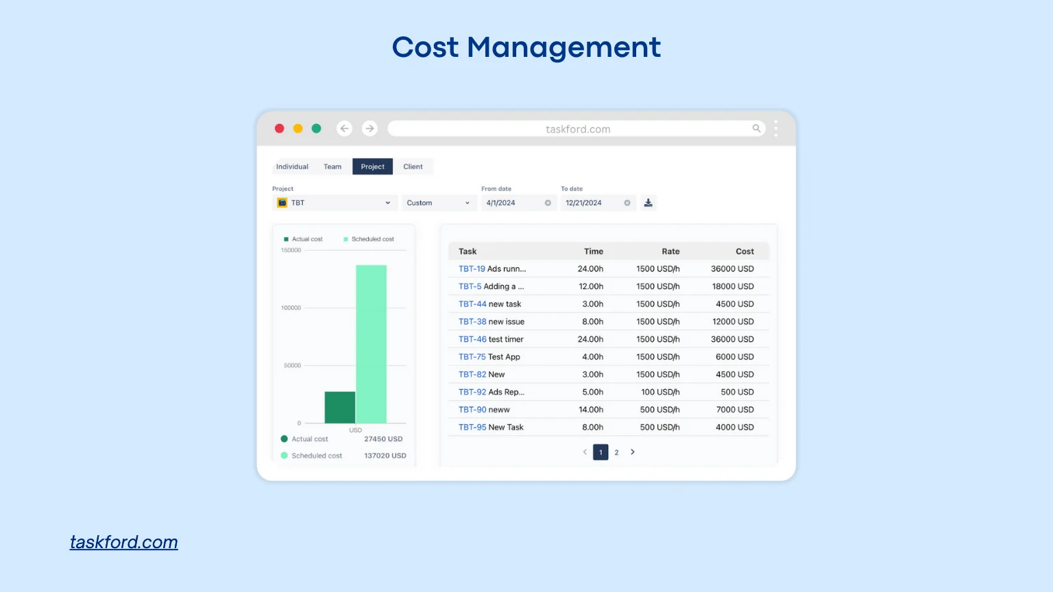 By linking work, resources, and delivery ownership, TaskFord helps teams set financial boundaries early and monitor how effort and capacity translate into cost during execution. This makes overspend risks (Actual vs Scheduled Costs) visible while teams still have time to adjust scope, priorities, or resourcing.