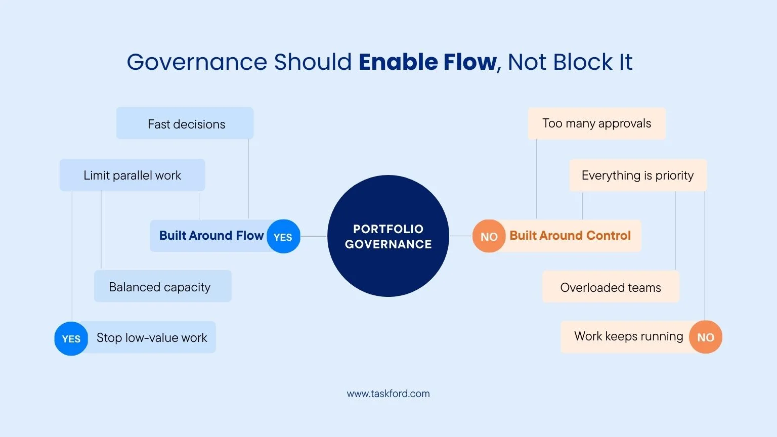 Portfolio governance does not manage people or daily work. It manages decisions and trade-offs at the portfolio level.