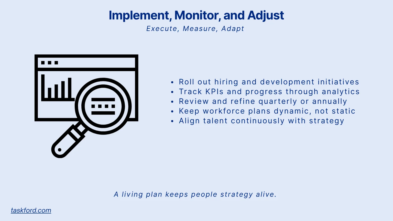 The final stage is implementation. A workforce plan is only effective when put into action and monitored continuously to stay relevant.