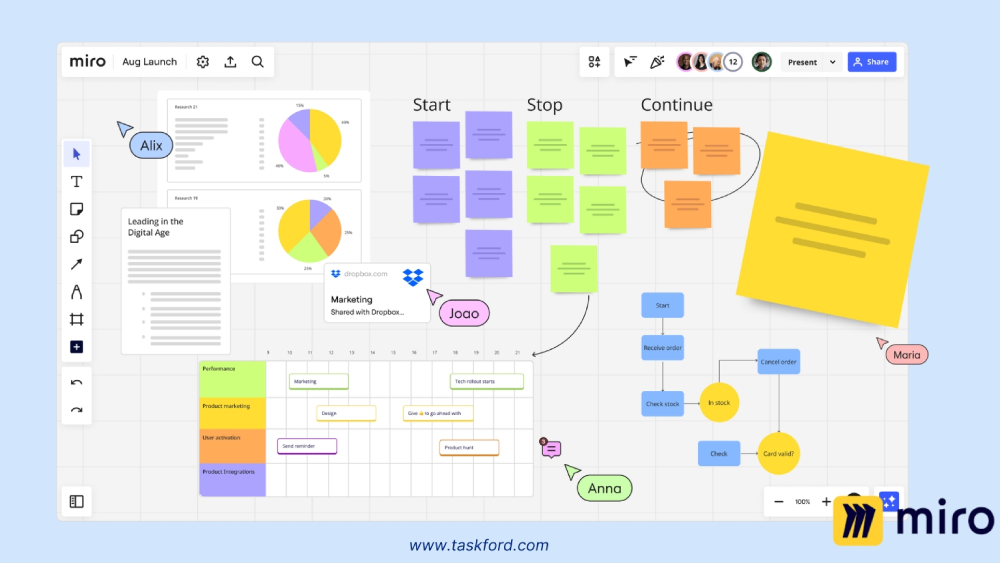 - Best For: Creative teams needing visual collaboration. A design team might use Miro to brainstorm campaign visuals, sharing interactive whiteboards across time zones to align on concepts.