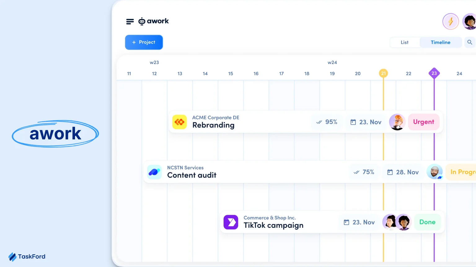 awork includes task and project management with visual planning tools such as boards and timelines. Projects can be structured around client engagements, making it easier to track deliverables and deadlines.