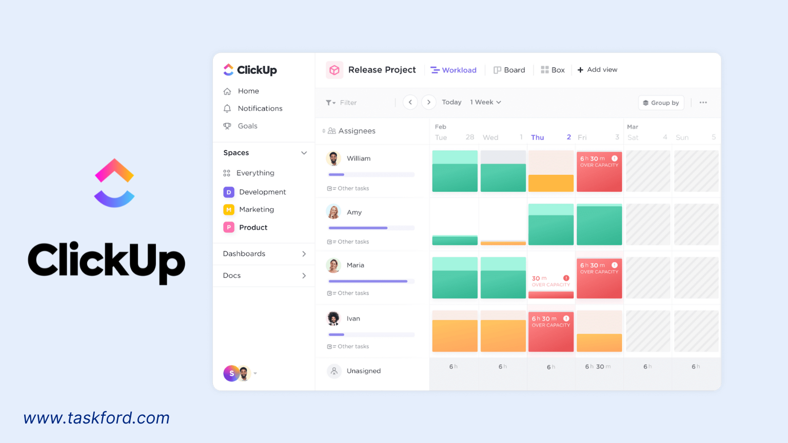 TaskFord is a versatile platform with exceptional workload management features, making it the top choice for teams seeking efficiency and precision. Its Workload view provides a clear snapshot of team members’ task assignments and capacity, enabling balanced workloads with ease. Gantt charts and timeline views streamline task scheduling, while robust time tracking and cost management features make it ideal for agencies and professional services. TaskFord’s straightforward interface ensures quick adoption across teams of all sizes. With advanced resource planning, task management, and project management capabilities, TaskFord outshines competitors for client-focused teams.