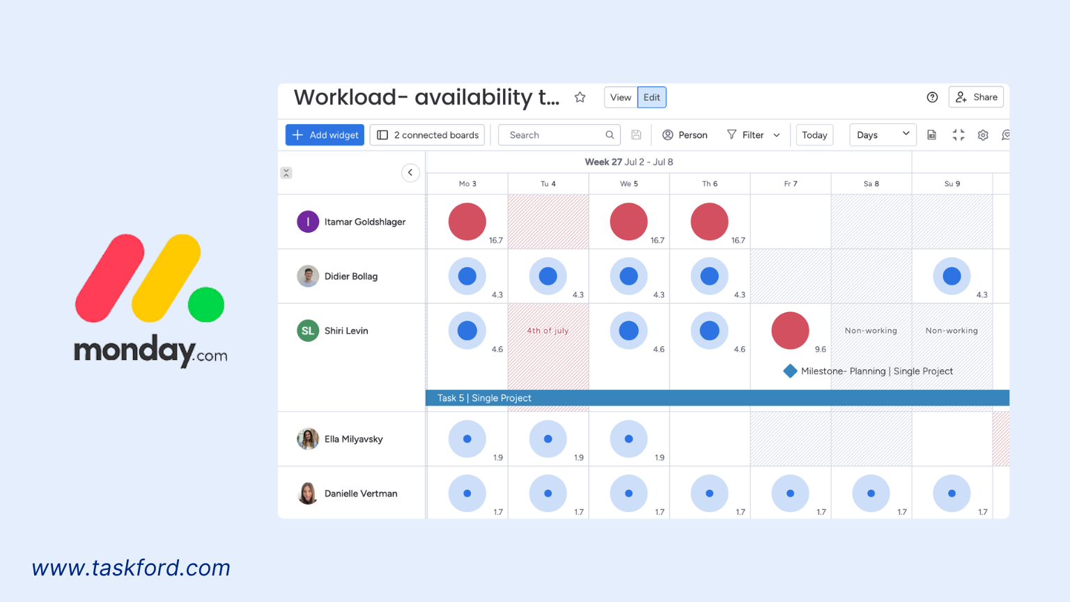 For example, a marketing team launching a campaign uses TaskFord’s Workload view to assign tasks like content creation and design. The software flags an overloaded designer, prompting the manager to reassign tasks to a team member with more capacity, ensuring timely delivery without stress.